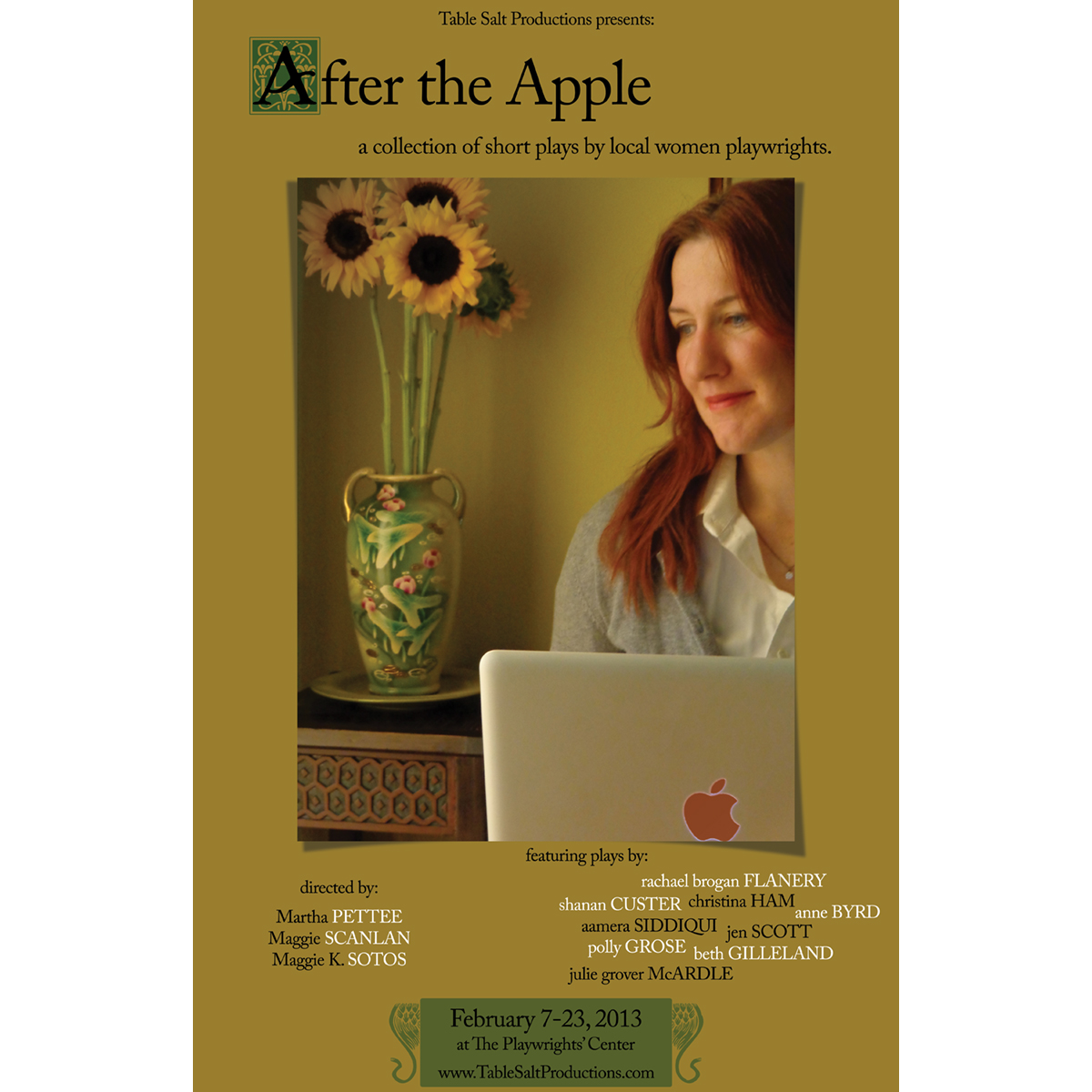 After the Apple is a collection of nine short plays by local playwrights Anne Byrd, Shanan Custer, Rachael Brogan Flanery, Beth Gilleland, Polly Grose, Christina Ham, Julie Grover McArdle, Jen Scott, and Aamera Siddiqui.
