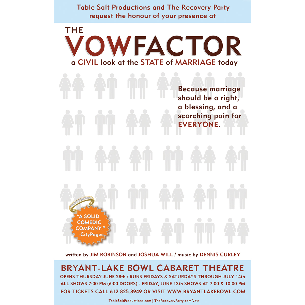 The VOW Factor takes a CIVIL (somewhat) look at the STATE of MARRIAGE today as it sets out to prove, once and for all, in a completely (almost) unbiased fashion, that marriage should be a right, a blessing, and a scorching pain for EVERYONE. Filled with side-splitting sketch comedy, meaningful monologues, sentimental ballads and a few surprises, and performed by "a solid comedic company" (City Pages) that is "just plain brilliant" (HowWasTheShow.com), The VOW Factor promises a fair and balanced evening of laughs and thought-provoking material — no matter what side of the aisle you sit on.